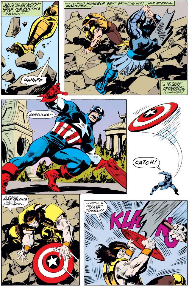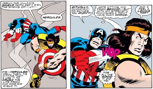 While Hercules admires the mighty shield, Cap reluctantly punches him from behind, to little effect.