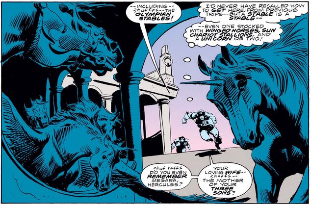 Zeus watches from another dimension as his son backhands Cap and marvels that “the masked mortal” nonetheless gets up. (Clearly he doesn’t read this blog.) When Cap realizes that Hercules does not remember who is, he decides to stir his memories while trying to delay another blow…