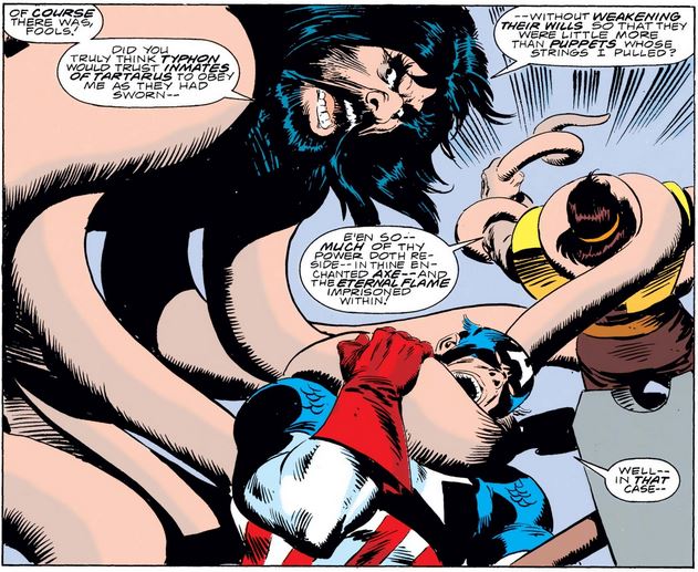 Cap valiantly joins the fight more directly, trying to use Typhon’s axe to relight the Promethean flame and bring back the Olympian gods, but is quickly trapped by one of the Titan’s tentacles. (Eww.)