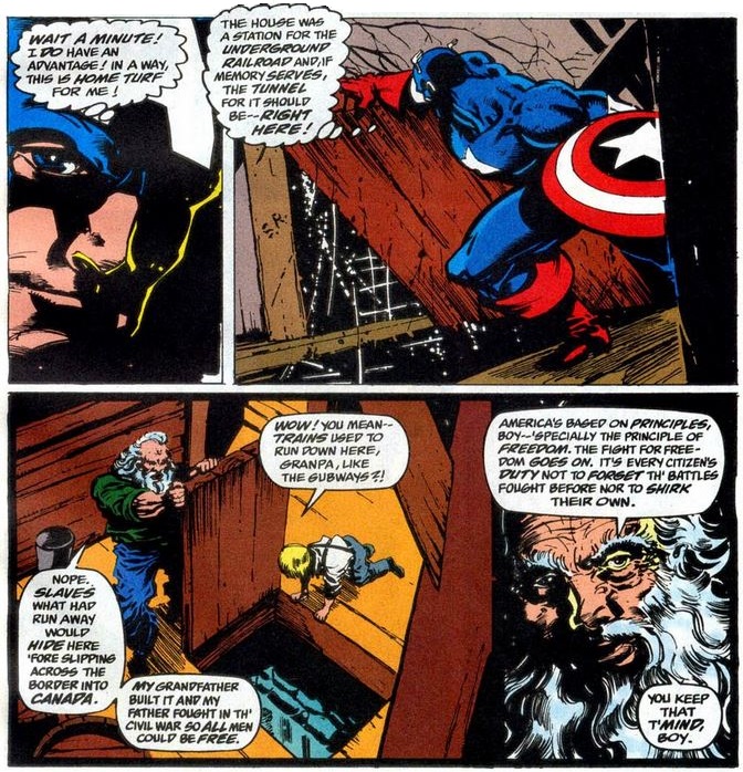 Seriously, though, I find it extremely heartwarming that Steve’s predecessors passed down the importance of principles such as liberty, not just in words but in action, expressed through duty. I believe this was the first mention of any of Steve’s family other than his parents—and very little was revealed about them either at this point—and can be seen as a noble effort to plant Steve Rogers’ family tree in the historical ground of America (as Jack Kirby did with the Revolutionary-era Captain Rogers in Captain America #194 and Bicentennial Battles). Unfortunately, this does not hold together with the recent emphasis on both of Steve’s parents being Irish immigrants (unless some of their elders came to America ahead of them and fought in the Civil War and helped with emancipation).