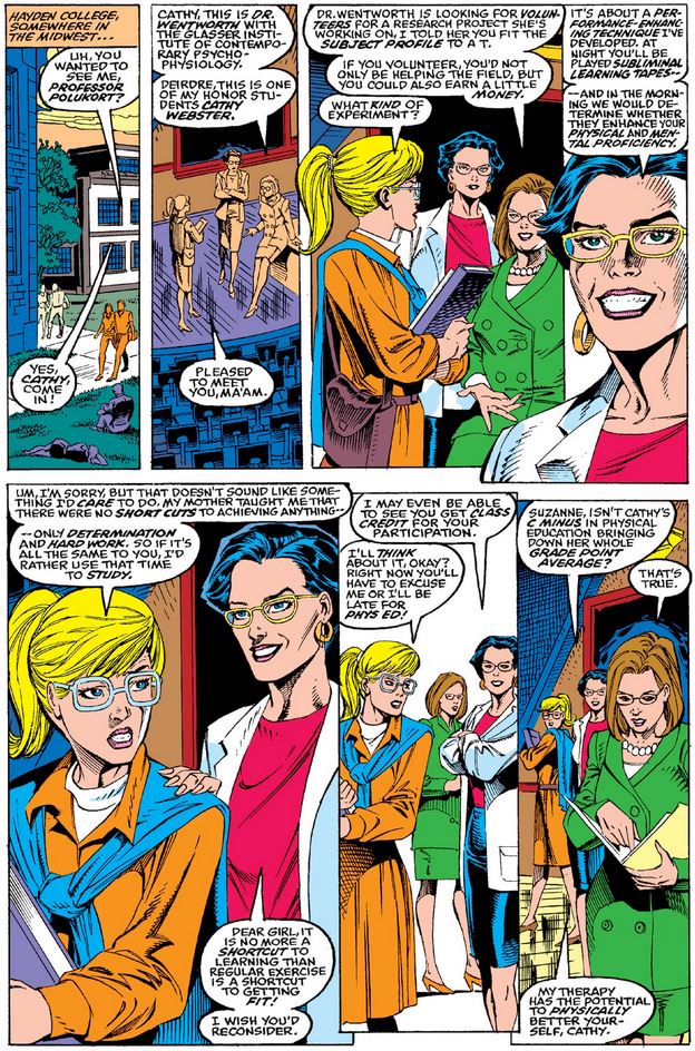 Let’s take this chance to switch gears and travel to a college “somewhere in the midwest”—they couldn’t even bother to pick a state?—where we meet Cathy Webster, a top student with no physical skills whatsoever who is offered a way to improve the latter (almost like a project of rebirth). She refuses based on her principled ethics…
