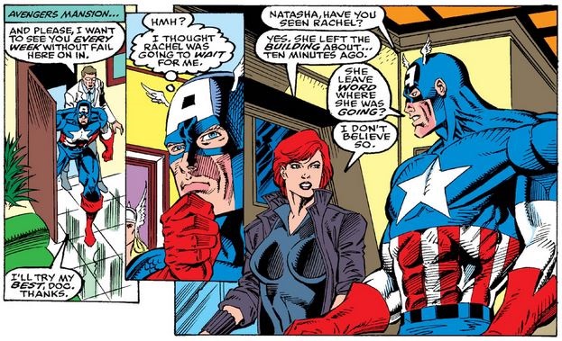 After leaving Dr. Kincaid, Cap wonders where Rachel has gotten to, and Natasha chooses this time to mince words.
