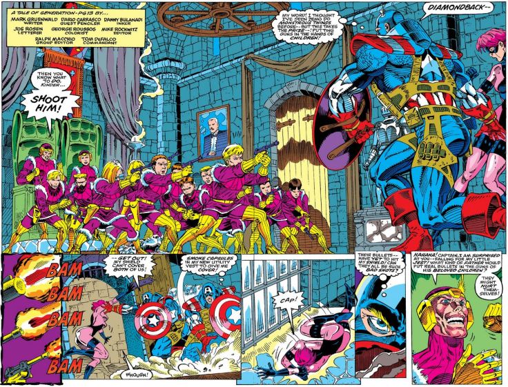 Captain America (vol. 1) #432, October 1994: Mark Gruenwald (writer), Dario Carrasco (pencils), Danny Bulanadi (inks), George Roussos (colors), Joe Rosen (letters). (More details at Marvel Database.)