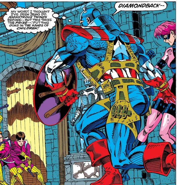 Cap curses himself for literally falling for Zemo’s trap, while Diamondback, whom Cap pushed out of the room earlier, searches the castle and runs into—again, literally—one of Zemo’s mushy robots.
