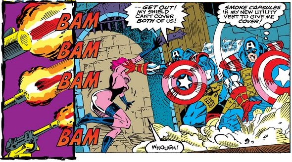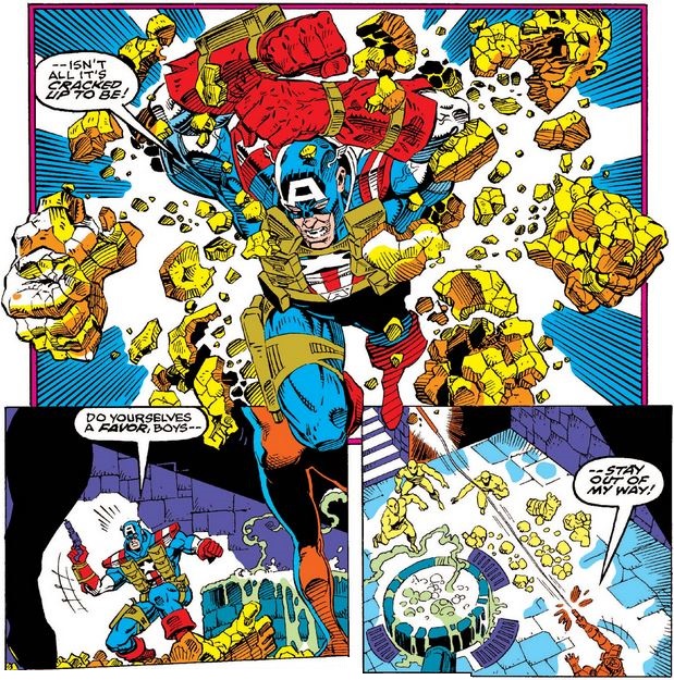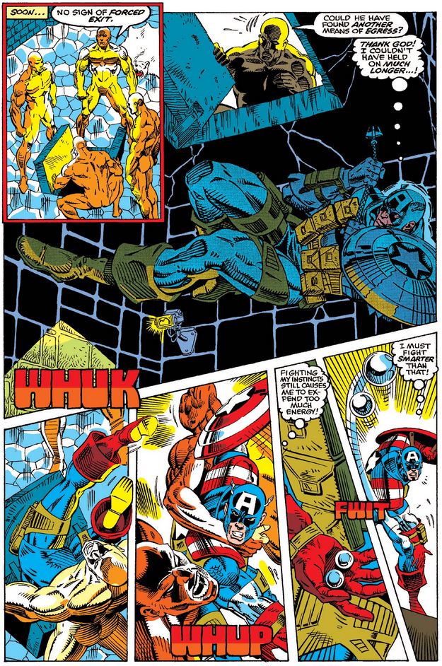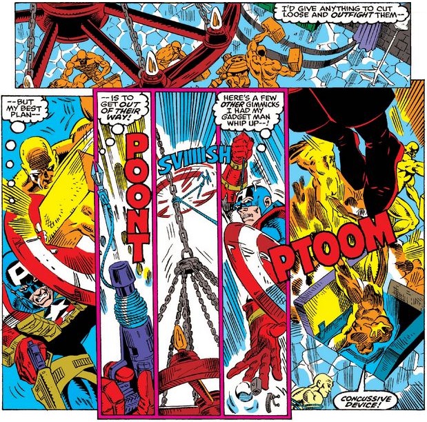 On the final page, Cap is learning why Spider-Man and Daredevil like swinging around New York City so much, but apparently the adrenaline rush is too much for him, and his muscles lock up at the same time the Putty-Men make like Voltron.