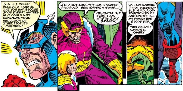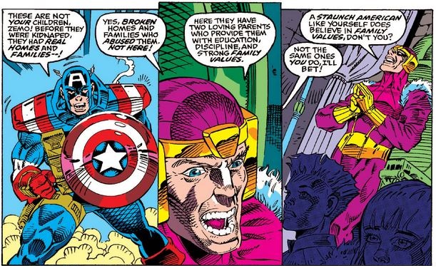 Cap confronts Zemo about the children, whom the villain claims he rescued from abuse in the name of “family values,” which Cap quickly rejects.