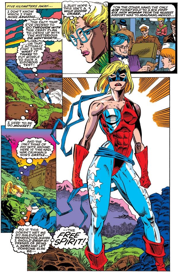 Nearby, we find Cathy Webster, the young woman introduced in the last issue, who is pursuing “Professor Wentworth,” the woman who enhanced her physical abilities while brainwashing her to lash out at men, leading her to become Free Spirit—sorry, the Free Spirit.