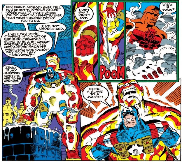 In the spirit of a Bond villain, Zemo tells Cap that he will soon be “embalmed” in Adhesive X—his father’s invention, introduced in Avengers #6, which is really only good for sticking a Zemo’s mask to his face. So Cap appeals to Franz, the Putty-Man within whose embrace he currently resides, and encourages him to embrace his autonomy instead (to no avail).