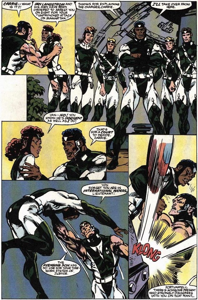 In issue #57, Navy lieutenant Ian Langstrom and his team come for Namor, and when he resists, someone thankfully dressed more colorfully shows up…