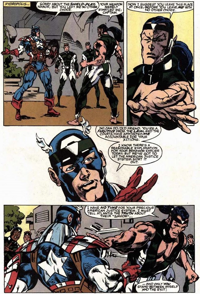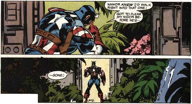 …long after it would do any good. Out of respect for their long friendship, Namor stands down and leaves for Atlantis, but when Cap gives chase, he falls into what seems more like a prank than a trap.