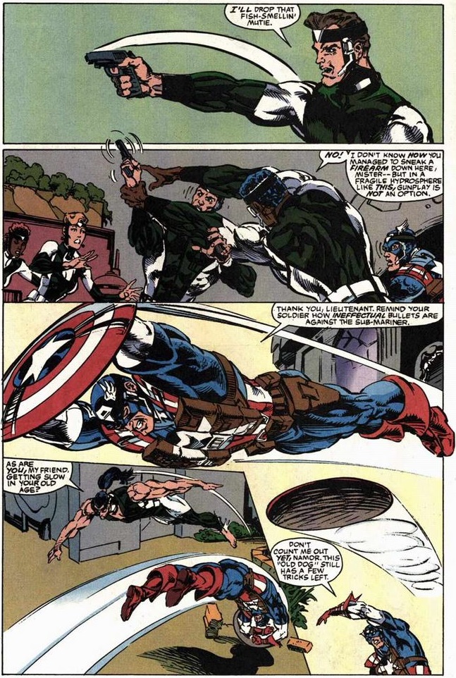 Namor tries to demean Cap for bringing back-up, but our hero knows when he needs to ask for help (especially in his current condition).
