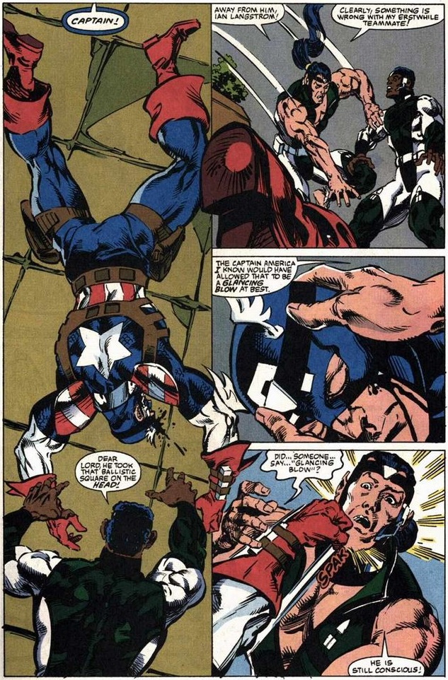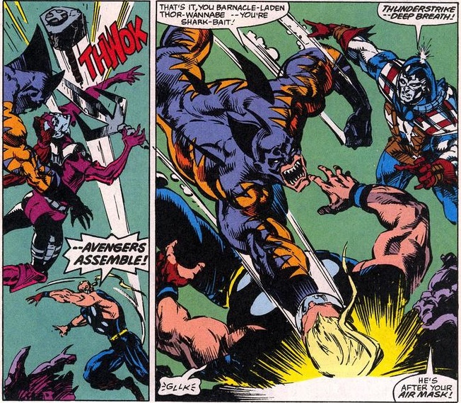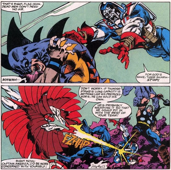 During the ensuing battle Cap focuses on keeping Thunderstrike alive as Tiger Shark targets his breathing gear…
