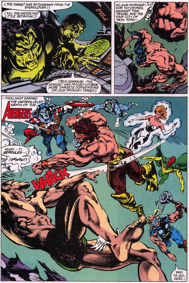 In issue #58, he returns with the Avengers, after Namor is also suspected of attacking a submarine—the “vessel” Hercule refers to below before performing a labor on the Sub-Mariner.