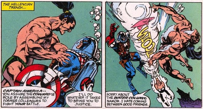As Tiger Shark readies to take a big bite out of Thunderstrike, Namor knocks him away, after which Cap shares his air supply with him, as a good teammate does.