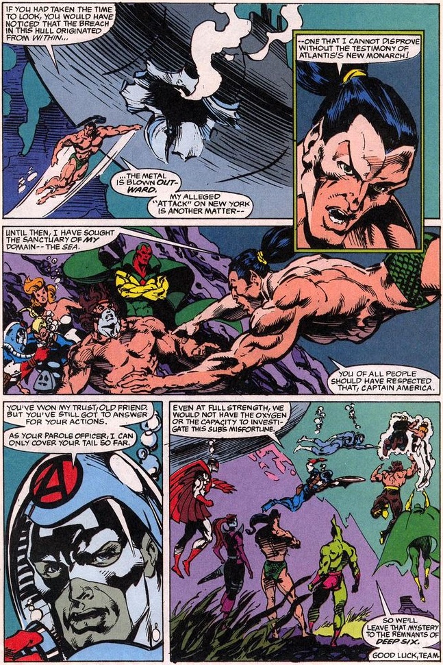 After praising his actions, Crystal gives Namor a chance to talk, and he takes the chance to point out the obvious with regard to the submarine before explaining what he needs to do about the New York attack. Cap also acknowledges his old friend’s honesty, and gives him a little more latitude—and then heads back to the surface before his oxygen runs out!