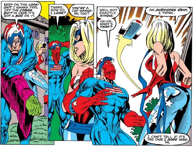 Hank was referring to a nearby Iron Man (remote-controlled), but we can just as easily explain the following excerpts from a recording of the proceedings, apparently the result of Cap telling Walker about his condition, most likely to account for the shoulder pads and all the pouches. (The girl is Rachel, the daughter of Julia Carpenter a.k.a. Spider-Woman.)