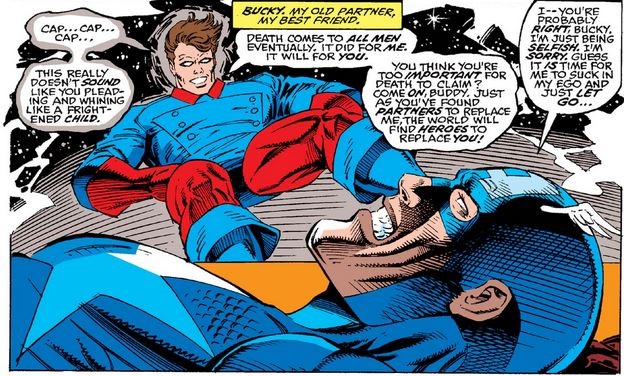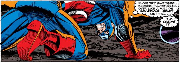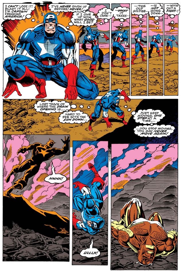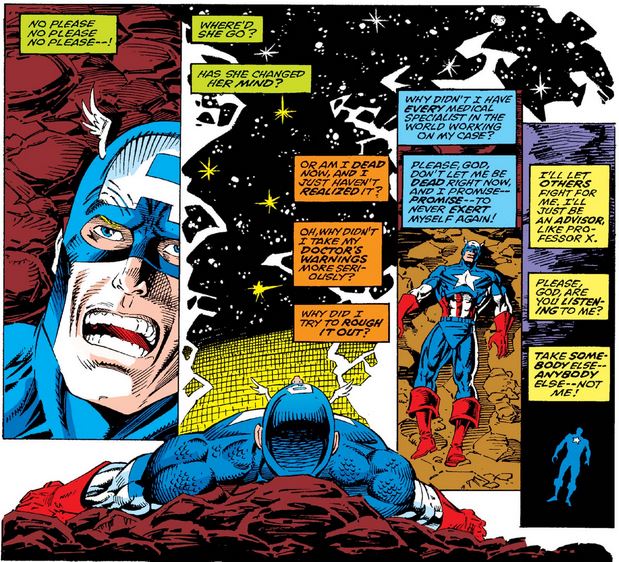 Again unable to move, Cap turns to criticizing himself, feeling he let down everybody who ever thought he was a hero or inspiration, rather than acknowledging that he did the best he could (and more than most would or could).