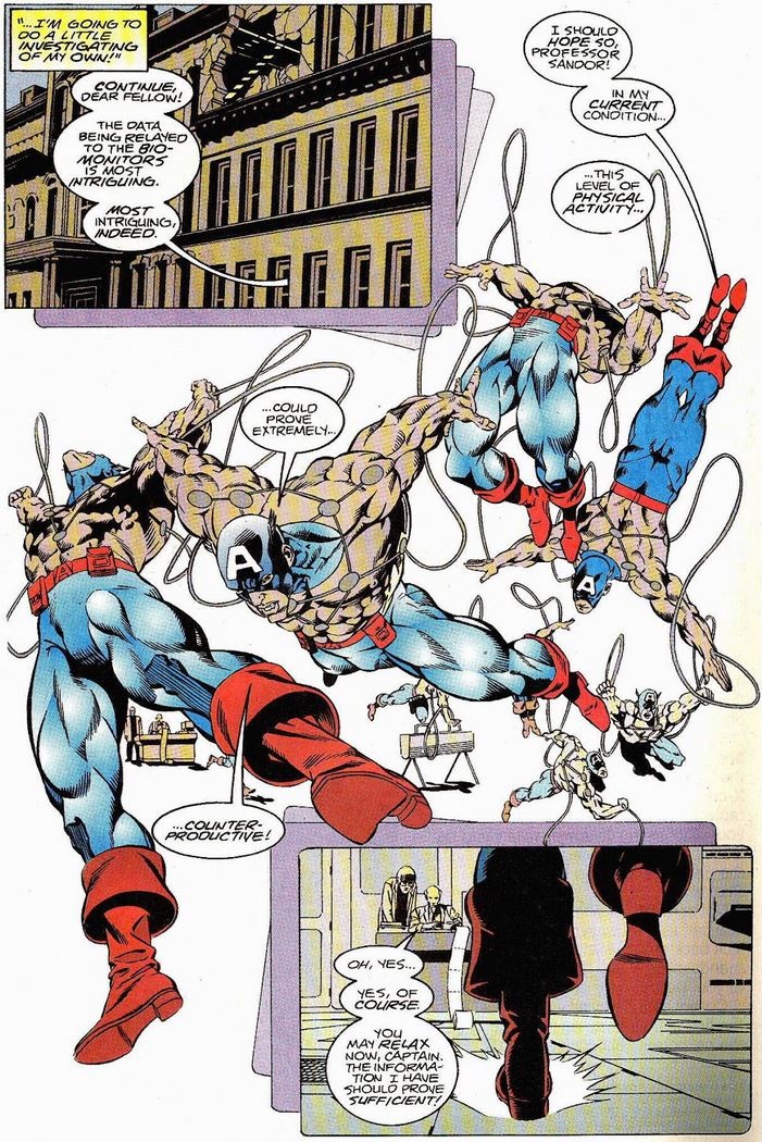 Finally, Cap plays a major role in the fourth issue of Fantastic Force, a Fantastic Four spin-off featuring a team led by Psi-Lord, a grown-up future version of Franklin Richards (son of Sue and Reed). When we first see Cap, he has asked an old friend, Professor Isaac Sandor, for help diagnosing his condition, but the good professor’s tests might just kill him!