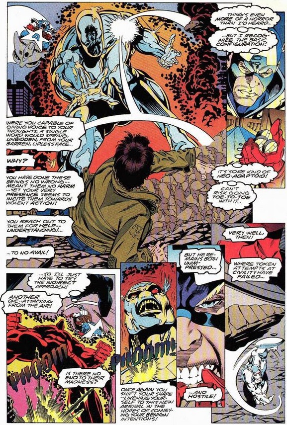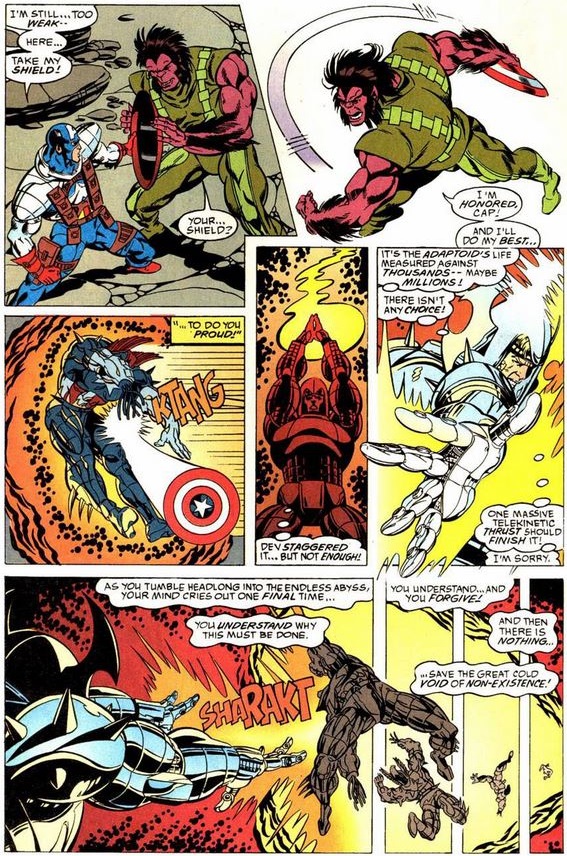 Cap finds the creature is a new version of the Super-Adaptoid—now with extra powers of internal monologue—and he wisely realizes he’s in no shape to take it on directly…