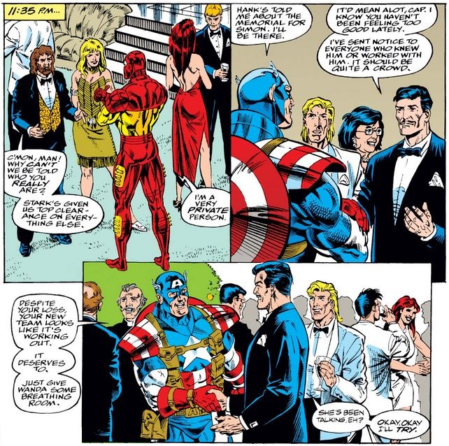 Before the end of the evening, Cap does say hi to Tony, mentioning the memorial for Wonder Man, who “died” in Force Works #1 (but returns a few years later in Avengers, vol. 3, #2). (Cap appears at the memorial in Force Works #10 but does not speak.) Tony also mentions Cap’s health problems, about which Cap confided in him in Iron Man #303 (but which Hank did not learn about until Captain America #435, after Cap was in Arizona… watch it, Tony, geez). Finally, Cap puts in a good word for Wanda (although I’m guessing she would rather he didn’t).