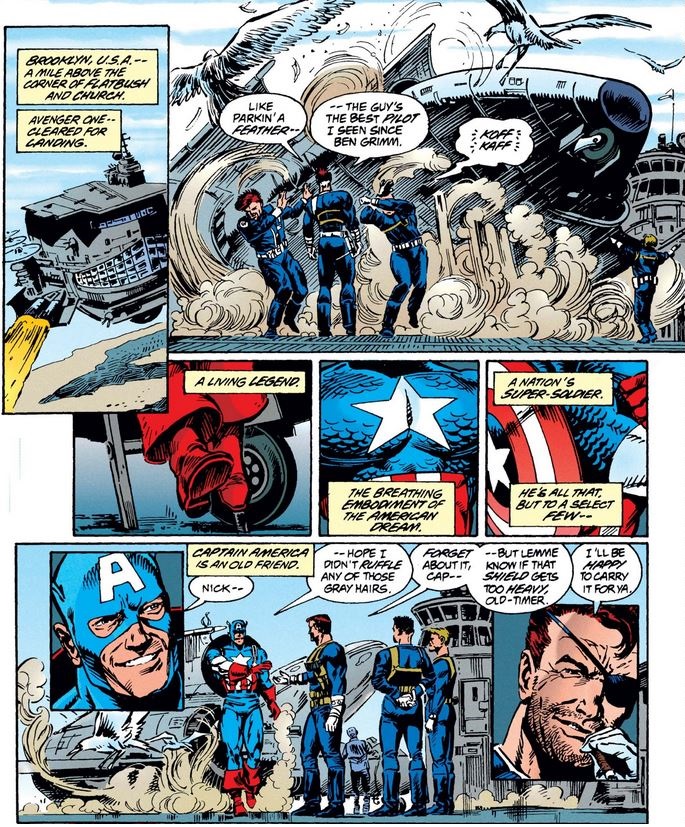 When we eventually see Captain America, it is in a very specific location above Brooklyn, and Nick gives an appreciated nod to the blue-eyed ever-lovin’ Thing before greeting another old WWII pal, after which they rib each other regarding their age (as folks of a certain age are wont to do… I’ve heard).