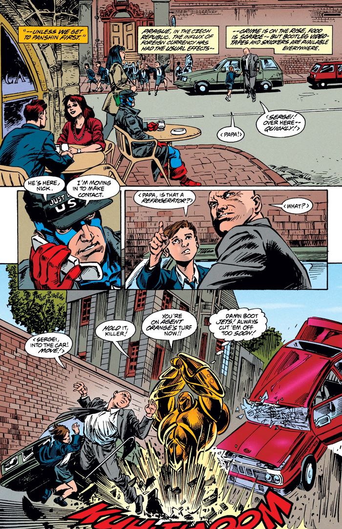 After we see Thurman and Gittes conspiring in the SHIELD cafeteria, eager to keep Panshin out and hinting at some involvement with Agent Orange, we go to Prague, where Cap adopts his old trench coat “disguise,” now with the addition of a matching hat. He finds Panchin (and his son Sergei), but unfortunately Agent Orange does too.