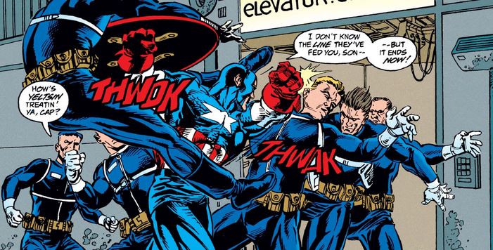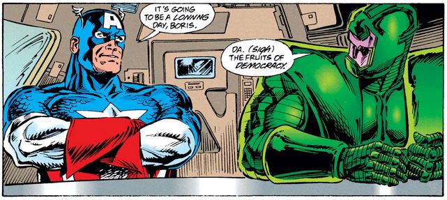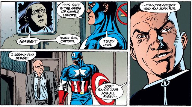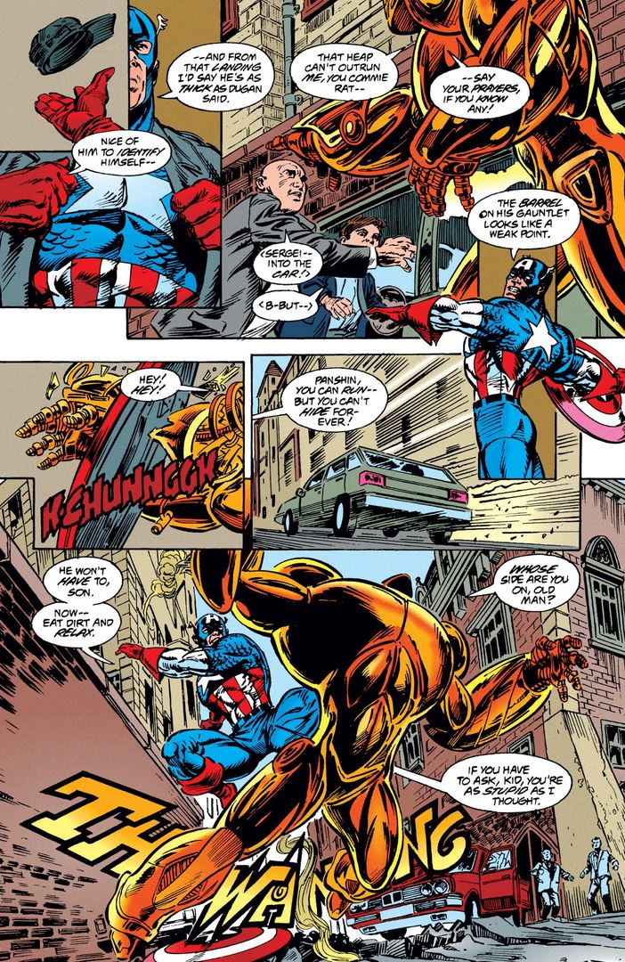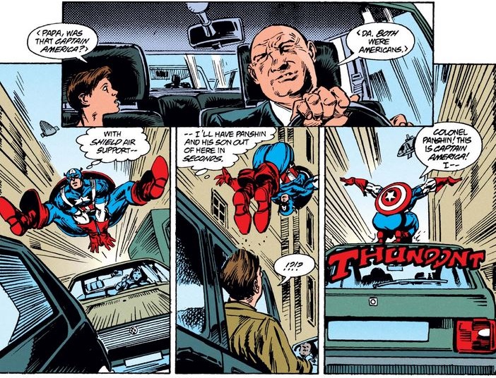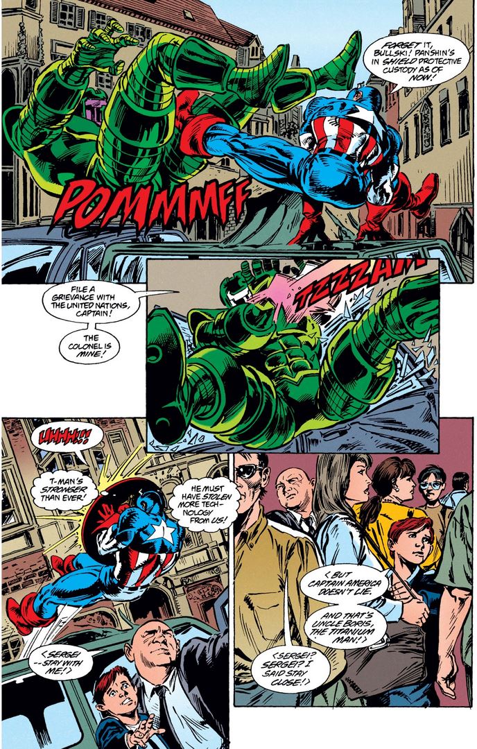 Cap shows why you must never skip leg day as he asserts jurisdiction over Panshin, which Bullski contests, while young Sergei shows that everyone knows what Captain America stands for.