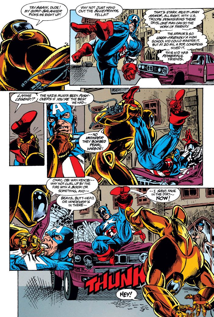 When Agent Orange catches up, we learn that Cap has some respect for the Titanium Man (who has had an ambiguous relationship with heroism, to say the least), but clearly none for his other armored foe.