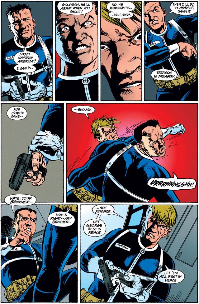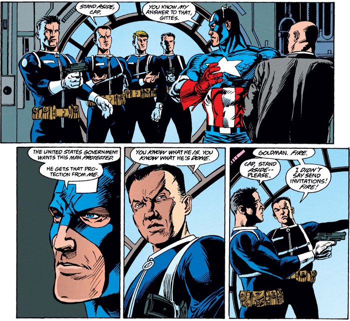 Cap refuses to let Gittes’ men shoot Panchin, citing the U.S. government’s orders as justification—which is odd, given Cap’s legendary refusal to “just follow orders,” but we can hope that he has judged those orders to be appropriate, despite his issues with the man he’s protecting.