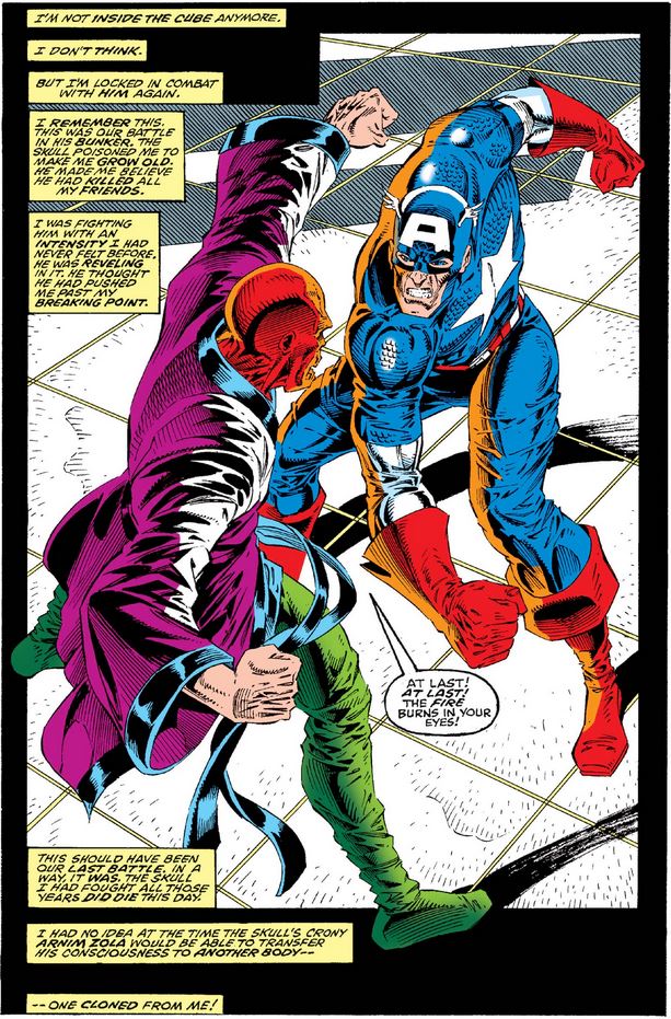 Next, we see the climatic battle at the end of Captain America #300, and Cap recalls his rage and the revelation that the Skull’s current body was cloned from his own.