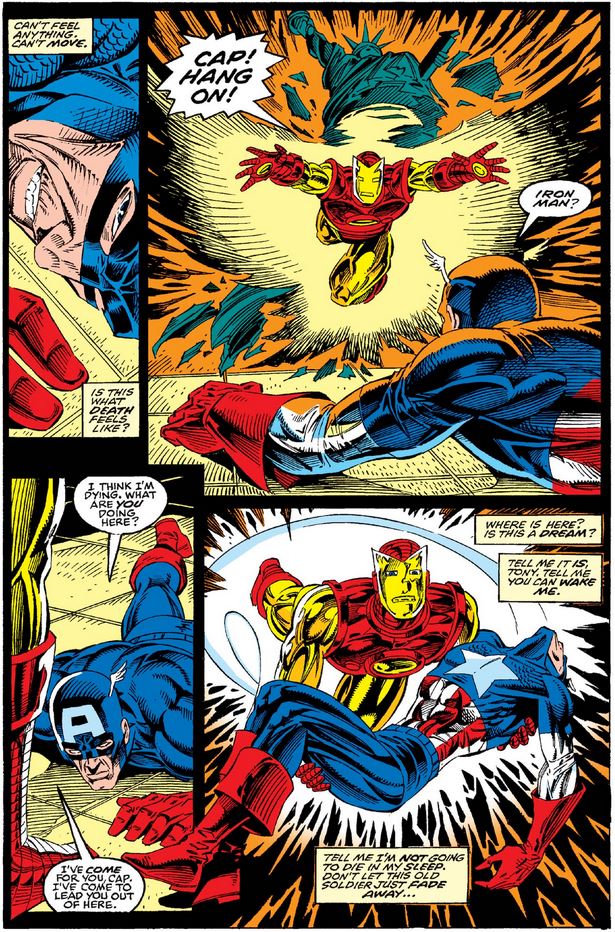 At what seems like Cap’s last moment, who should appear but Iron Man, breaking through Lady Liberty like the Kool-Aid Man, to rescue him.