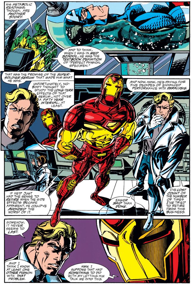 But Tony’s not done yet: In Iron Man #314, he embarks on a fantastic voyage in Cap’s body to install a “biochip” that will get him back some mobility (presumably similar to the one Tony had implanted in himself in issue #248 to reverse his own paralysis following being shot in issue #242).