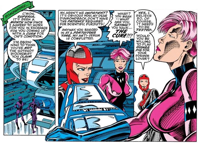 We’ll return to Bernie and Mike later, but now let’s check in on Cap’s more recent romantic partner, Rachel Leighton aka Diamondback, who is working for the villainous Superia in exchange for a promised cure for Cap—which she needs to test on someone, and there’s only one person in the room who has some super-soldier serum in her blood (since issues #409-410).