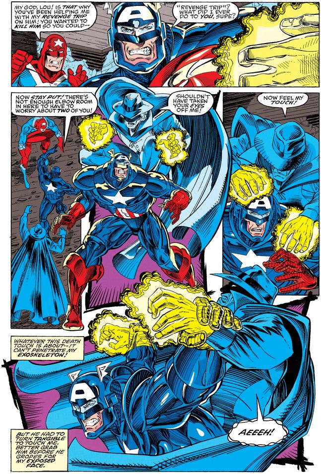 When Cap arrives at Farrell’s apartment he makes like the Kool-Aid Man, and Dead Ringer transforms from Basilisk (never mind) to Death-Stalker (whom we saw in Daredevil #155-157) and thwarts Cap’s initial attack.