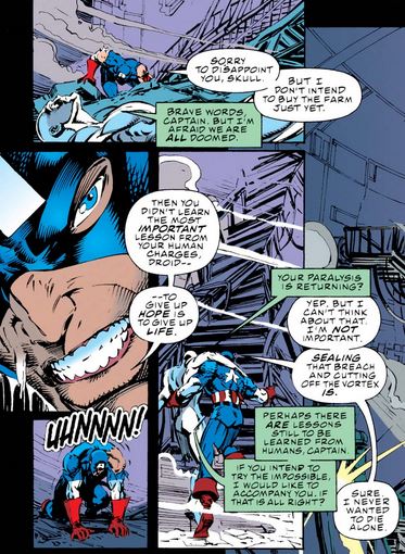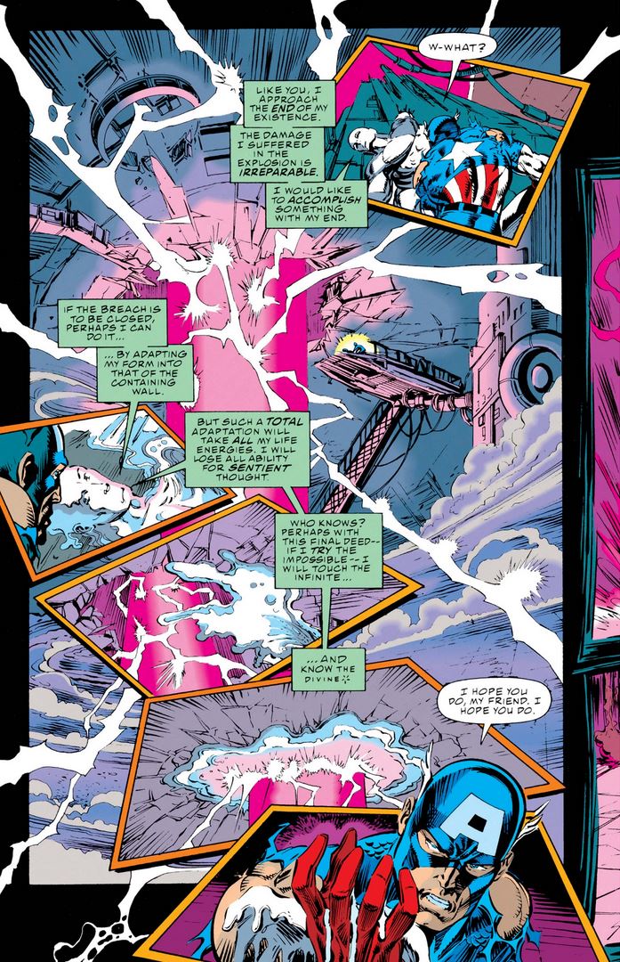 Cap’s resolve is unaffected by the expired super-soldier serum, so he pushes on, determined to seal the interdimensional breach and demonstrate the power of hope to the Adaptoid (who offers to help).