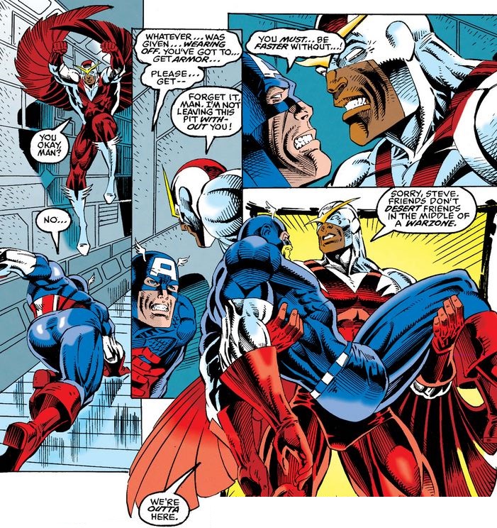 Later, as the two heroes breach the AIM facility, Cap’s muscles give out again, but when he asks Sam to go find his armor, his old friend refuses to leave him alone, evoking a military principle Cap should appreciate.