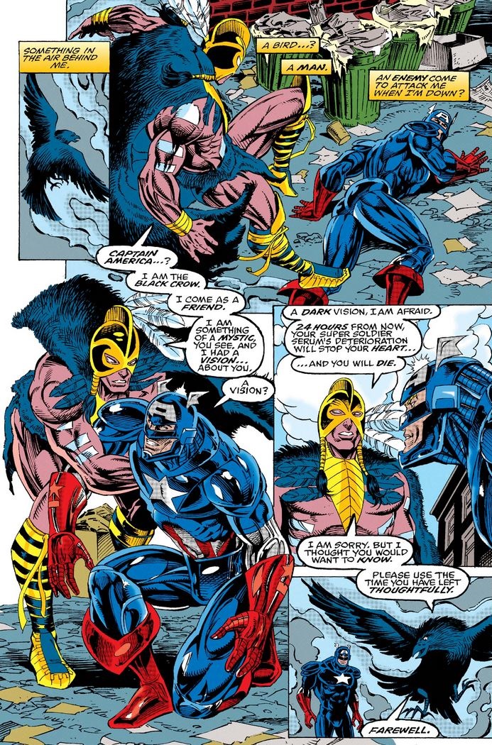 He is soon visited by Jesse Black Crow, who helped save Cap’s life in issue #300 and to whom Sam Wilson appealed for help with Cap’s condition in issue #440. Even though their spirits interacted on another plane in issue #300, here they finally meet in corporeal form, and Black Crow tells Cap of his latest vision, which doesn’t give him a lot of time.