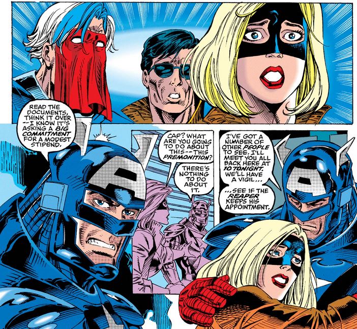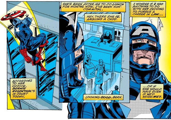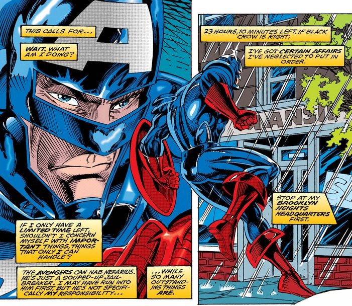 It doesn’t take Cap long to reconsider his priorities and redirects his attention to that which only he can do: setting his own affairs in order, which is a much better use of his time, given that there are at least a thousand superheroes in New York who can catch Nefarius.