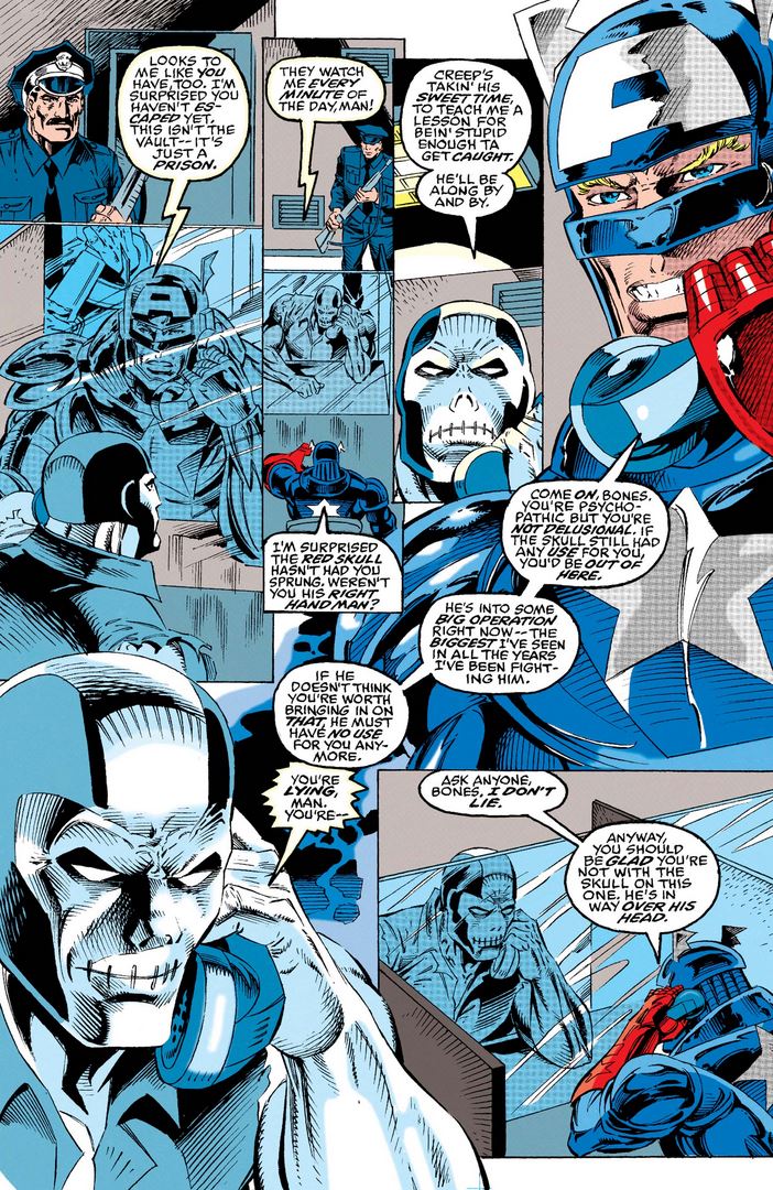 Then Cap keeps goading Crossbones about not breaking out (which, as I recall, is a good thing) and being left behind by the Red Skull, who has bigger plans. Crossbones calls him a liar, but he should really know better.