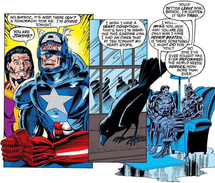 Cap spends several of his precious final hours with Batroc—maybe some enterprising writer can fill that gap someday!—before he lies down, too tired in every way to worry about optimizing his remaining time. His final thought, as far as we know, is not kind to himself, but is very much keeping in character.