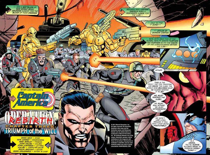 This issue continues “Operation Rebirth,” the first full storyline in Mark Waid and Ron Garney’s first run on Captain America, which finds our hero fighting alongside Sharon Carter—who has been alive this whole time, as explained in the last issue—and the Red Skull, who gave him a blood transfusion to save his life so he could help defeat the Kübekult, a Nazi group bent on using a Cosmic Cube to create a New World Reich run by Adolf Hitler (who had been captive in the Cube for years).