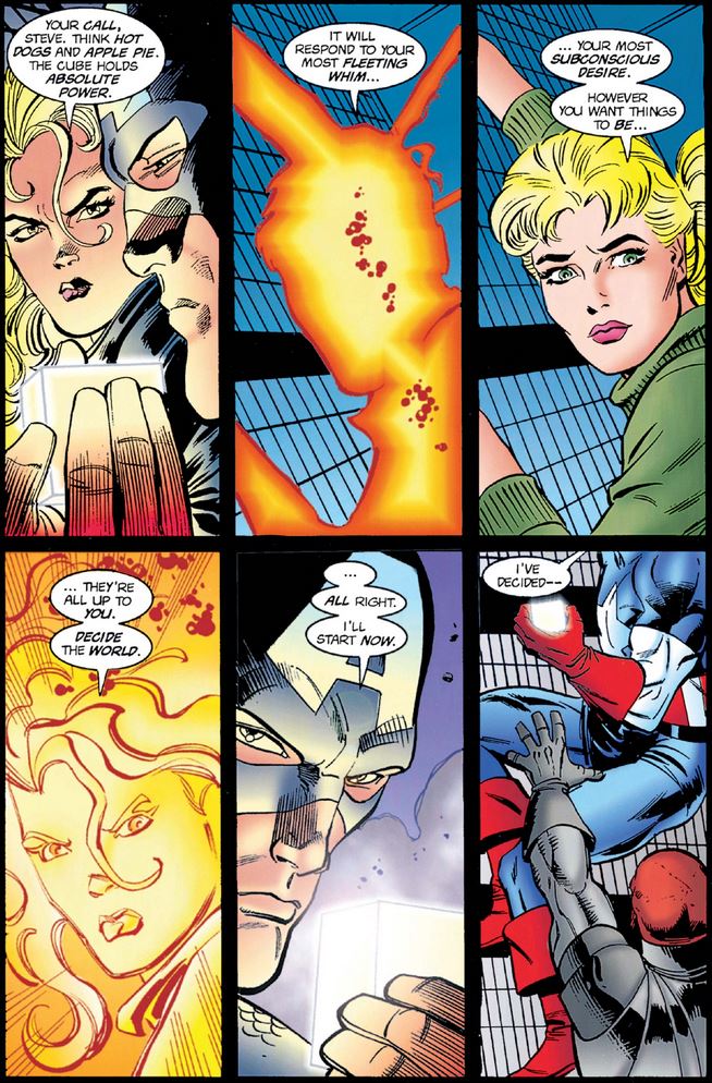 After an explosion separates the uneasy teammates, Cap searches the compound for Sharon, finding her in possession of the Cube, planning to reverse the Kübekult’s changes to reality with her own vision of how the world should be.