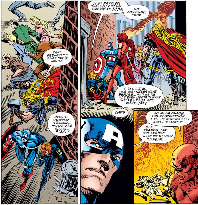 Avengers #402 opens after a massive EMP shut down power in New York City at the end of X-Men #55. The team focuses on search and rescue, starting with the subway tunnels, as Cap realizes it’s better to move the stalled train rather than simply let all the passengers out to stumble around in the dark.