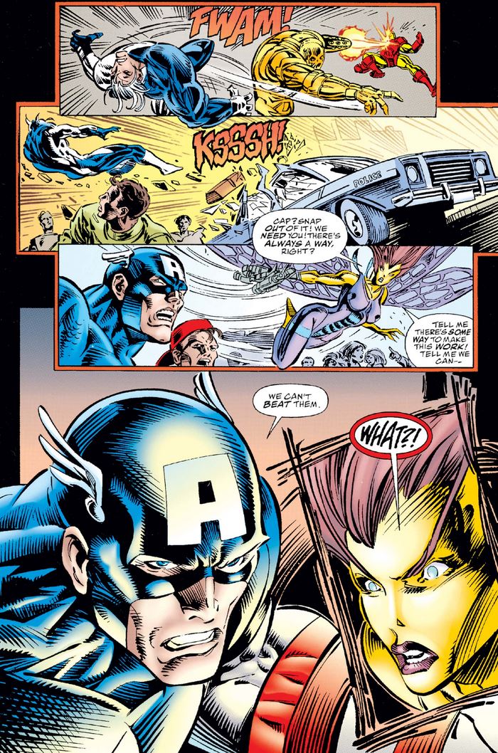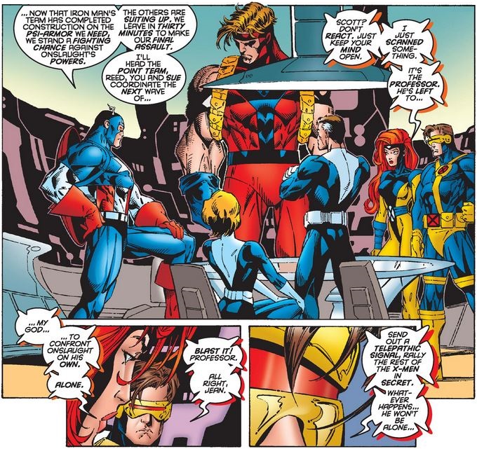 Cap gives final orders to Hank Pym, Mr. Fantastic, and the Invisible Woman, while Jean Grey tells Cyclops how Professor Xavier, back to his old self at last, is planning to confront Onslaught.