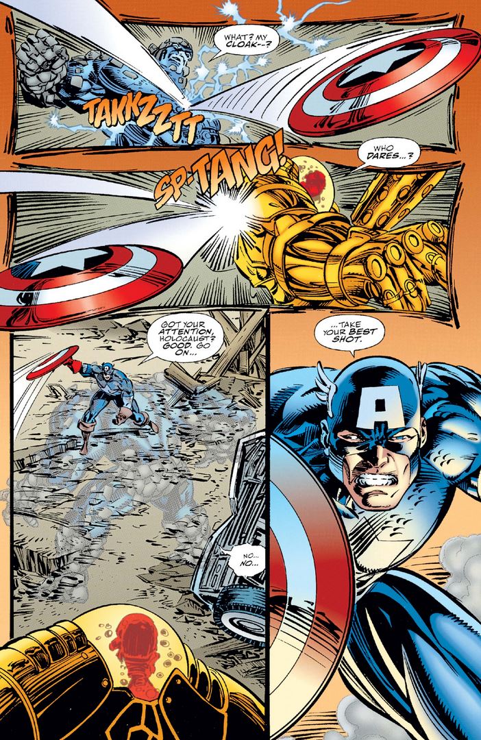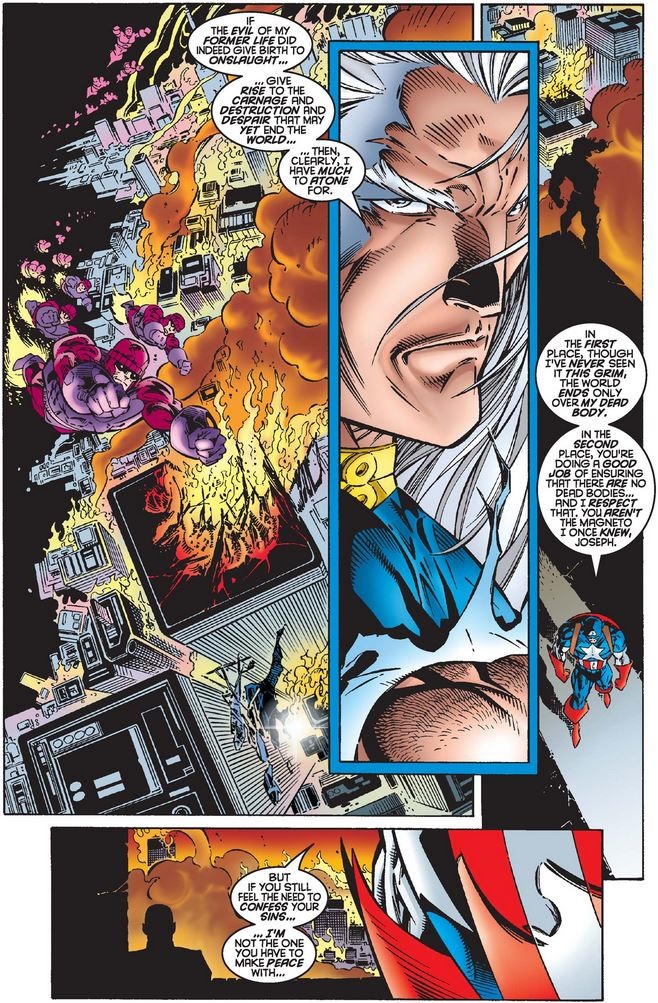 Joseph admits that he feels some responsibility for Onslaught, if his old evil Magneto personality is indeed part of him, but Cap acknowledges that he is now a different man who can forge his own path in however little time they have left (although Cap tries to remain optimistic about that too).