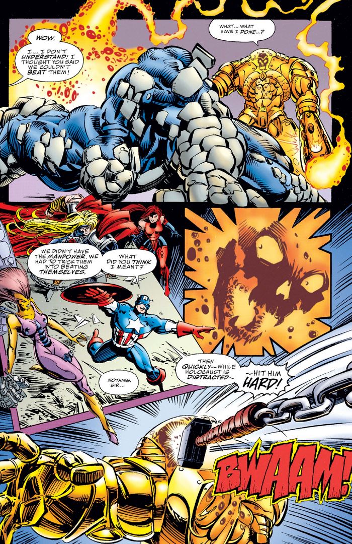 Meanwhile, the Hulk is debating battle strategy with Cap, arguing that the perfect is the enemy of the good, and surprise is sometimes more important than preparedness.