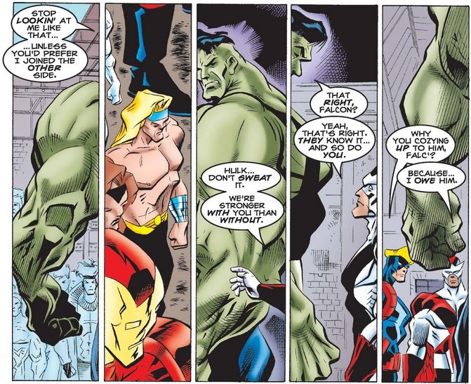 Taking place around the same time (although Thor lost his shirt somehow), The Incredible Hulk #445 features the Green Goliath’s own contribution to the fight, alongside some of the Avengers (as mentioned above). Although some of the collected heroes are skeptical of the Hulk, despite the fact that Bruce Banner is in control of him now, the Falcon is not, and Hawkeye wonders why.