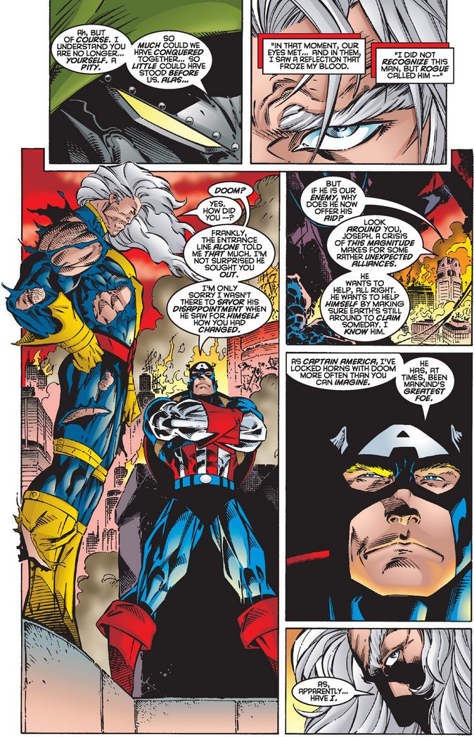 This encounter is told by Joseph to Cap, who explains why Doom might align with him temporarily, even though usually he is a foe—as, Joseph admits, Magneto is too.