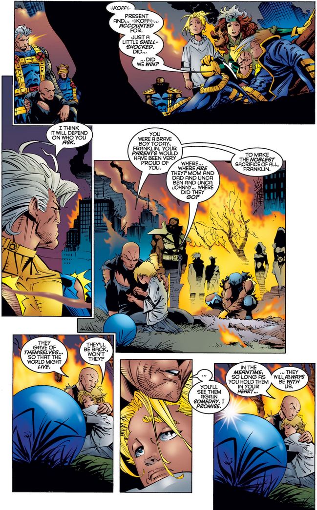 After Reed, Sue, and Bruce Banner jump in, the X-Men unleash their full might on Onslaught, destroying him—and, presumably, all of the heroes contained within him. But wait, Franklin Richards is doing something with his reality-altering powers… what could it be?