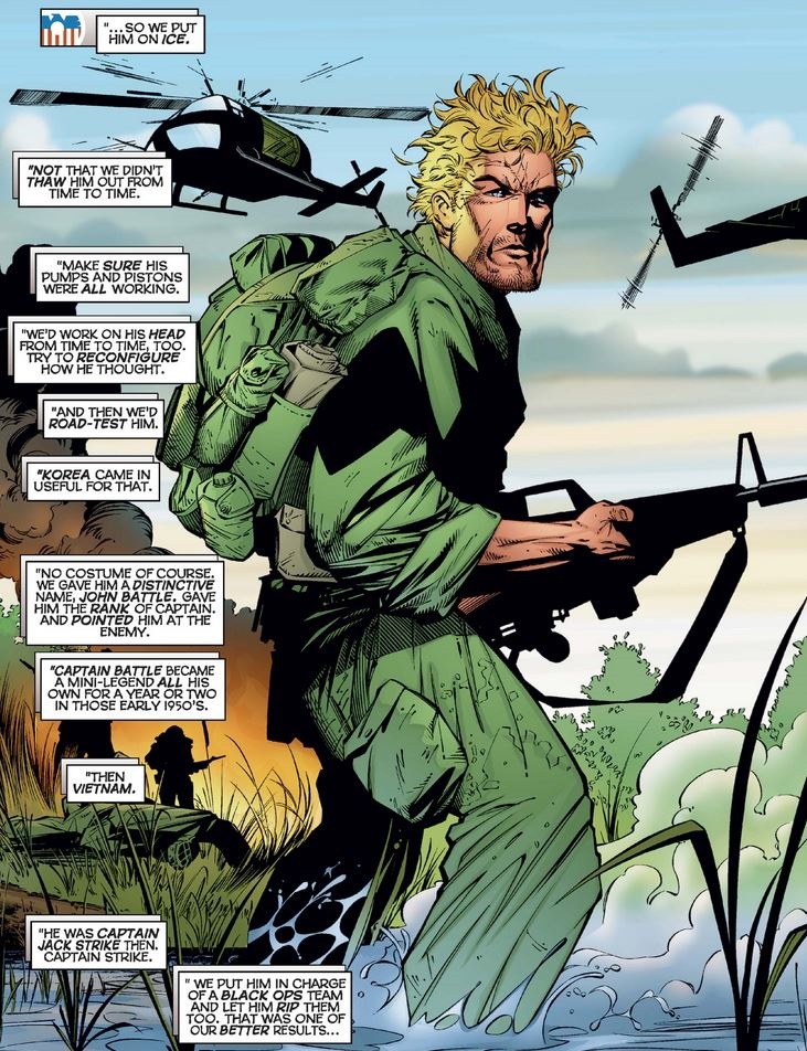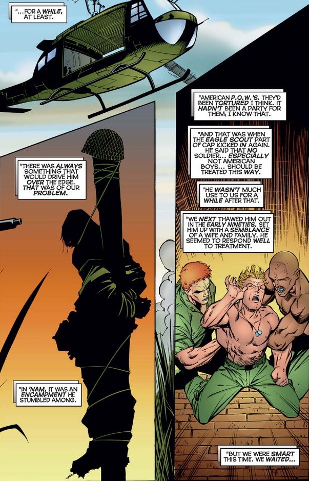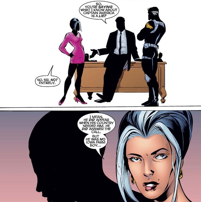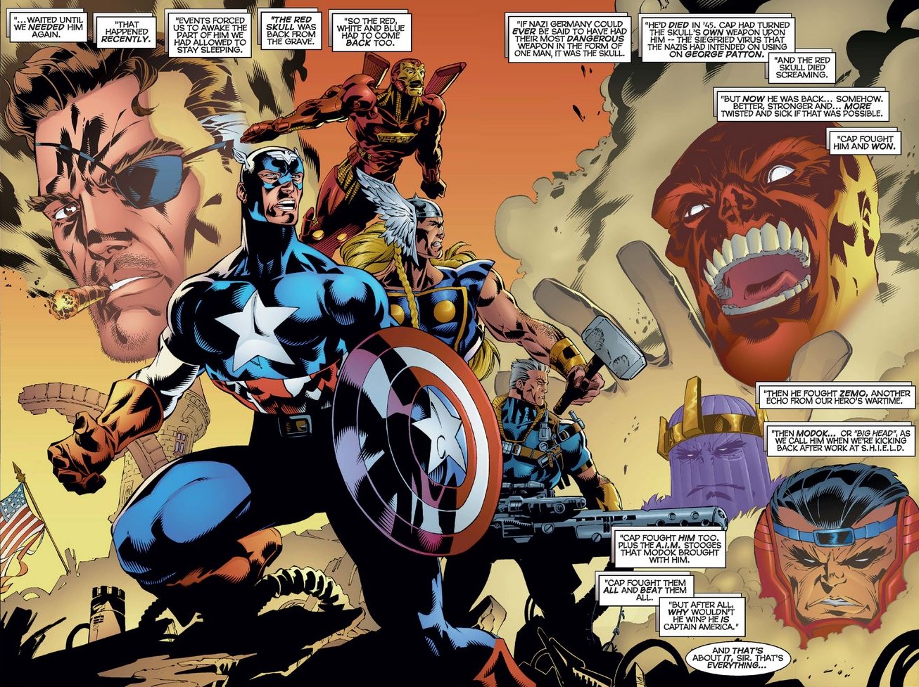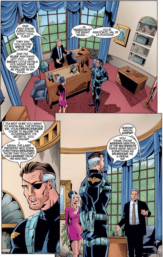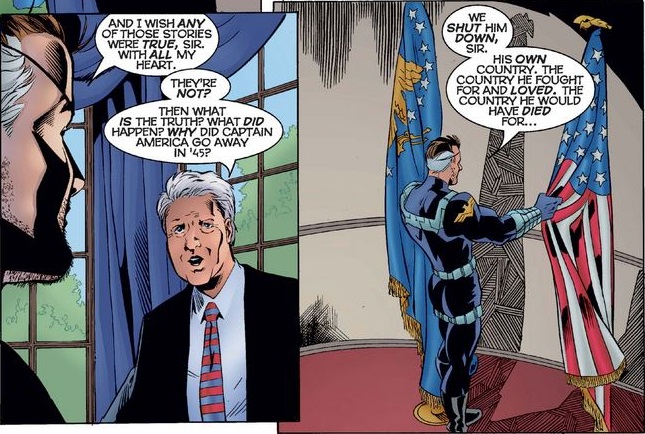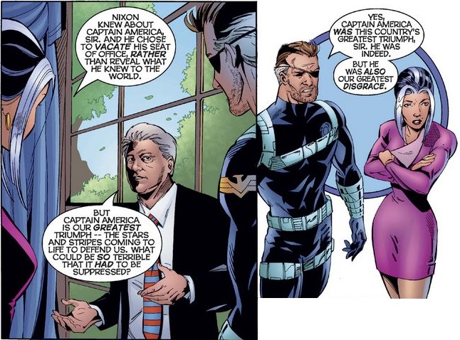 Most of the issue deals with filling in the details of Cap’s history in this universe, explained by Nick Fury and the Contessa Valentina Allegra de la Fontaine after President Bill Clinton demands answers.